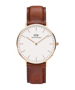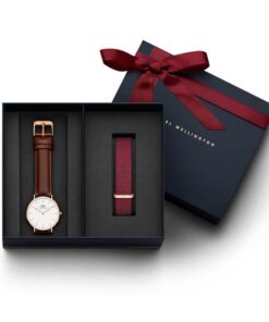Classic St Mawes features a slim case, an eggshell-white dial and a brown leather strap made from genuine Italian leather. Paired here with the ruby red Roselyn NATO strap. Your purchase will be delivered in one of our specially designed boxes with gold debossed Daniel Wellington logo.